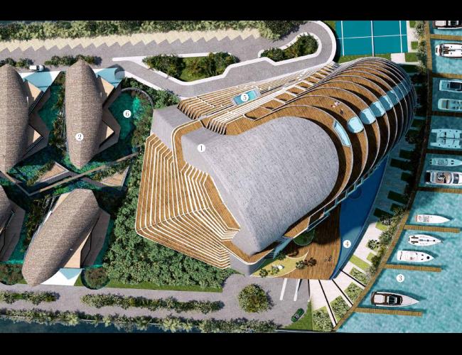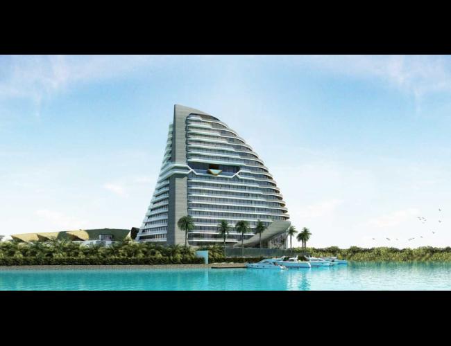la impresión de que un tiburón nada entre otros edificios en Puerto Cancun.